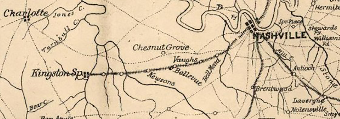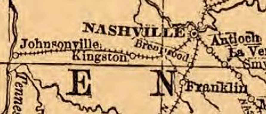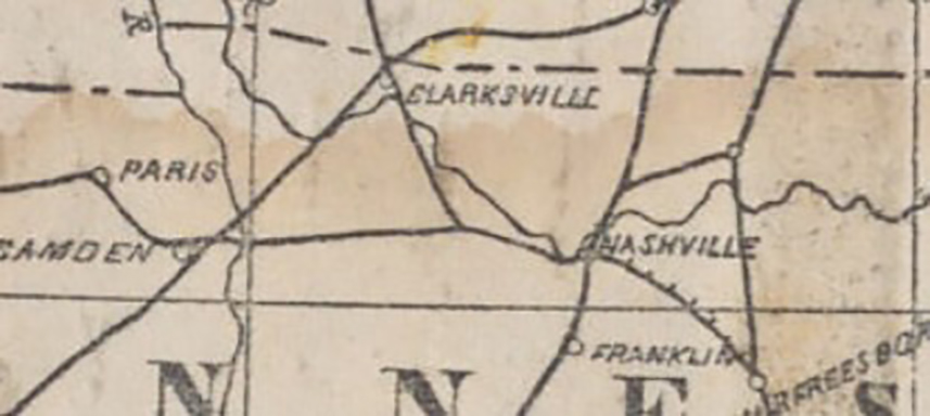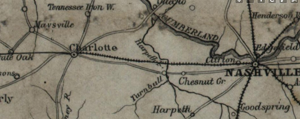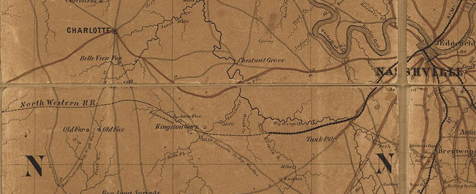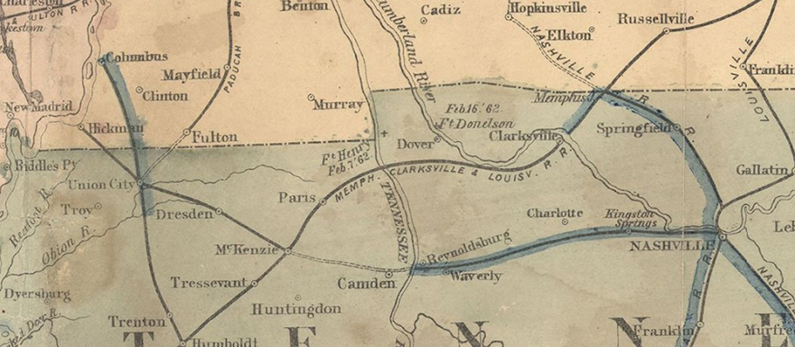 1862 map of Kentucky and Tennessee showing the Nashville & Northwestern Railroad going to Charlotte