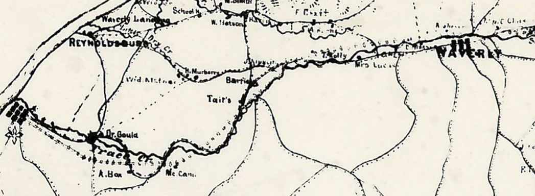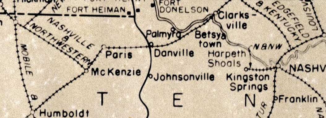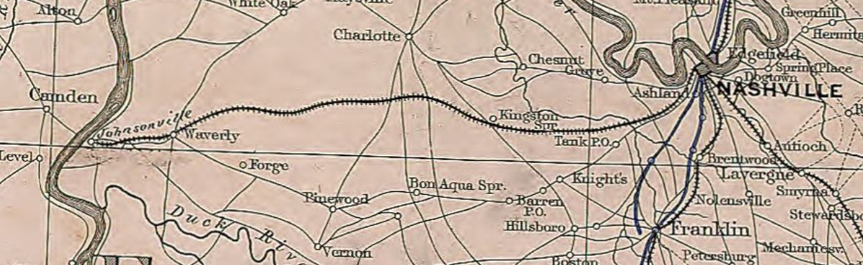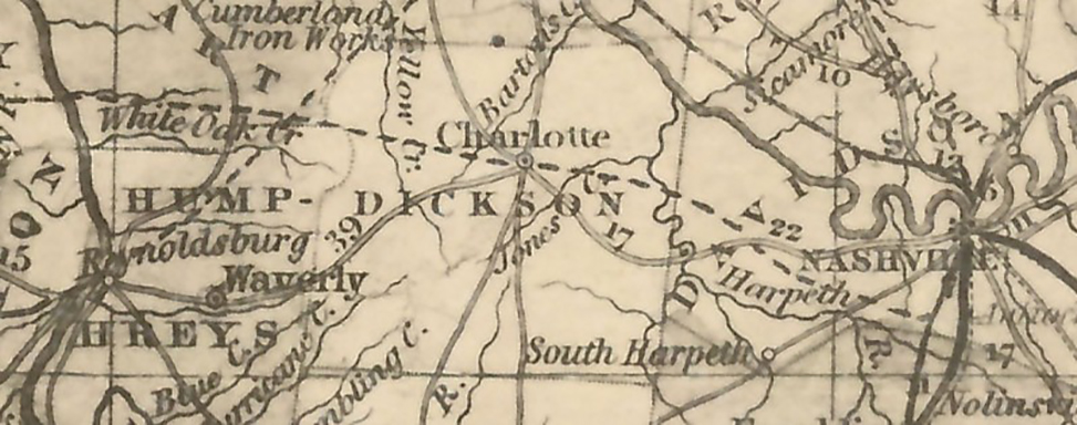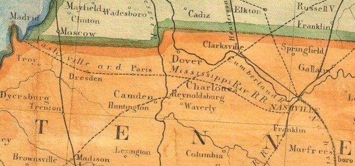 1854 map by Thomas, Cowperthwait & Co. showing steamboat, stage and railroad routes in 1854. The Nashville & Northwestern Railroad route is shown as "proposed", going through Charlotte and hitting the river north of Reynoldsburg.