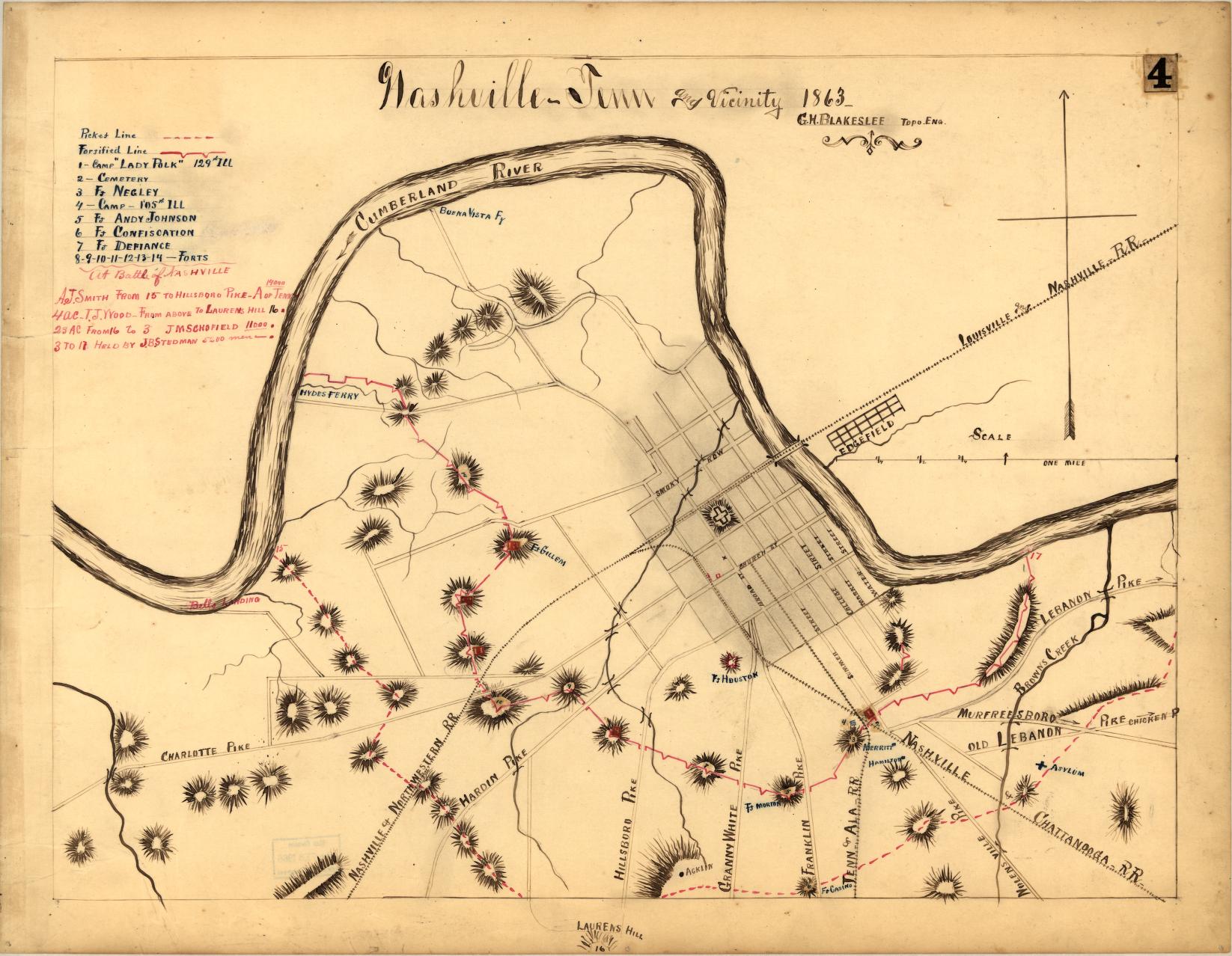 1863 map by G. H. Blakeslee Topo Engineer showing forts, camps and the Nashville & Northwestern Railroad