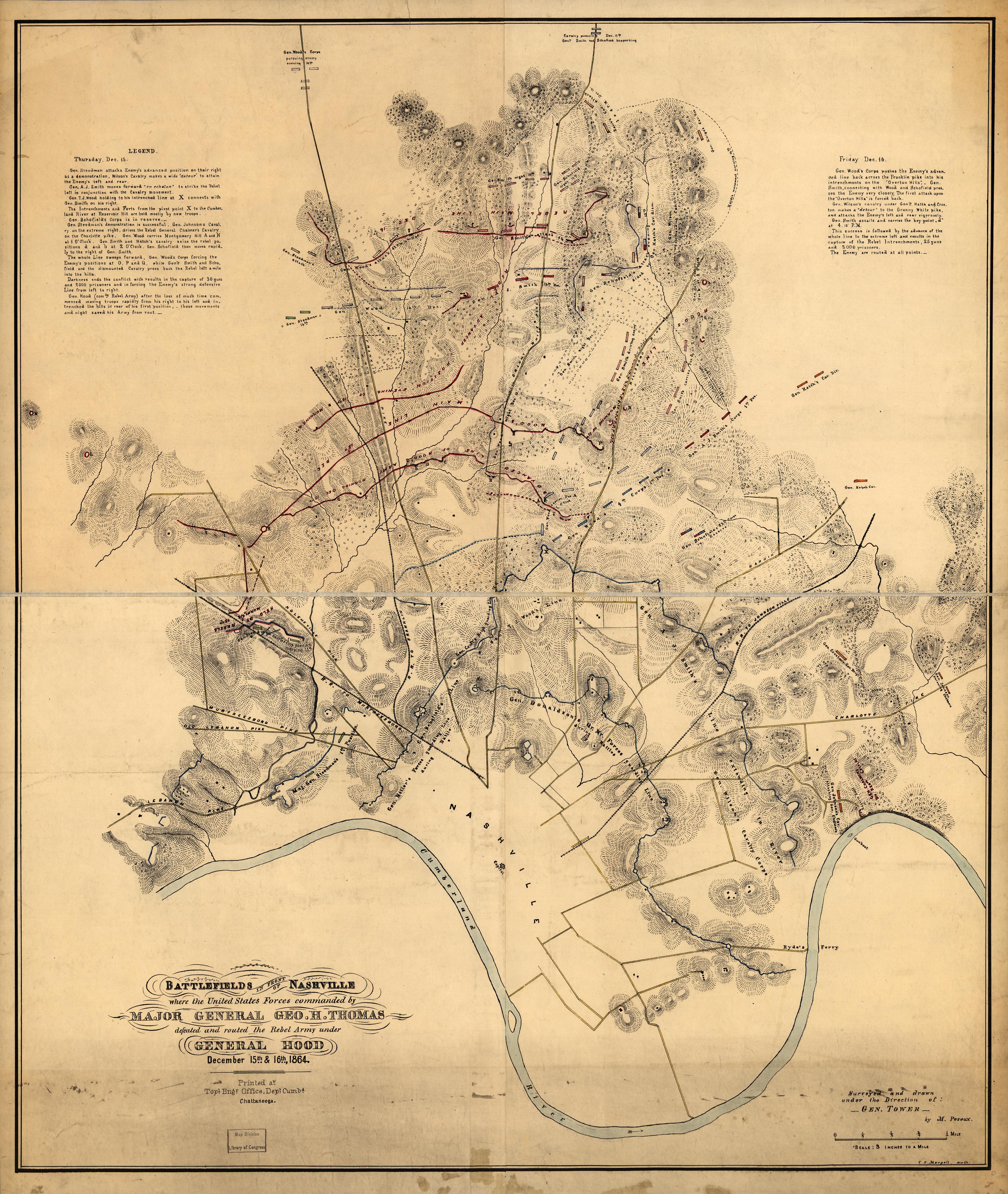 1864 map of the Battlefields in front of Nashville where the United States forces commanded by Major General Geo. H. Thomas defeated and routed the Rebel army under General Hood, December 15th & 16th, 1864
