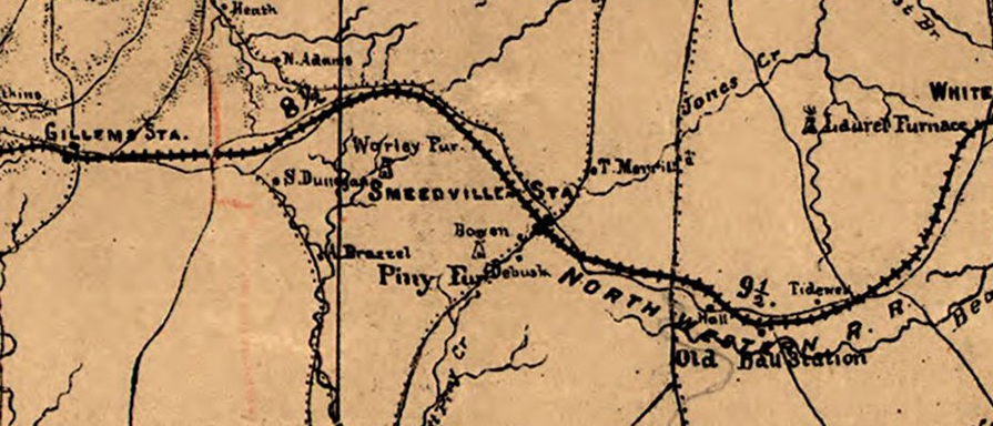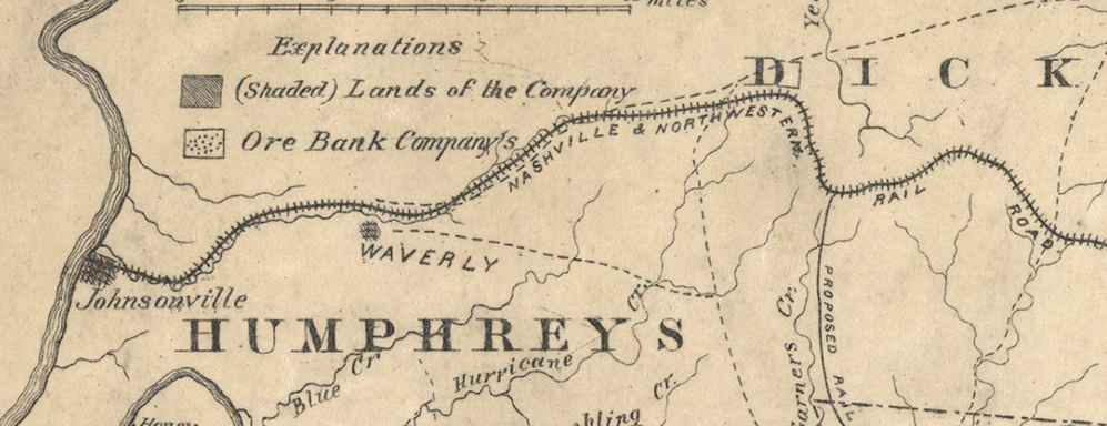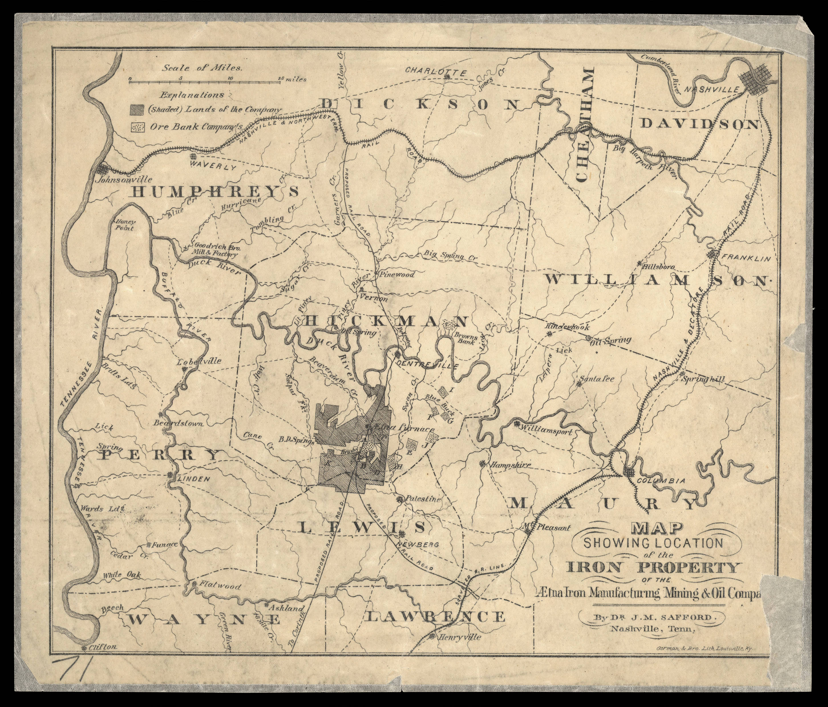 1868 map showing Aetna Iron manufacturing, mining and oil company property in Tennessee, showing the Nashville & Northwestern Railroad
