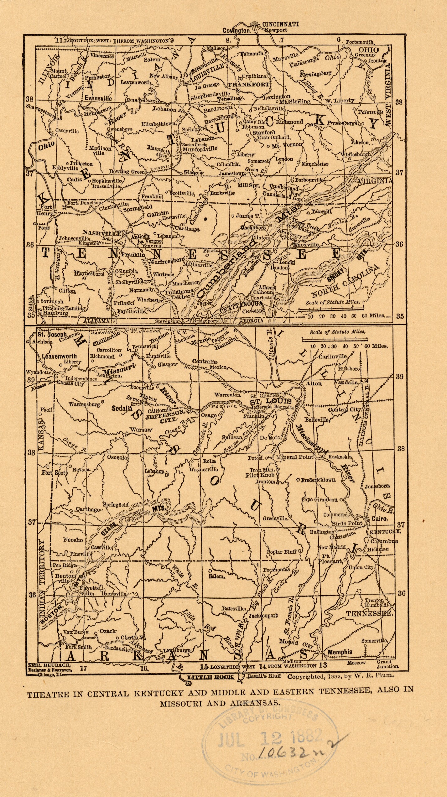 Map by W. R. Plum published in 1882 of the Theatre in central Kentucky and eastern Tennessee, also in Missouri and Arkansas.