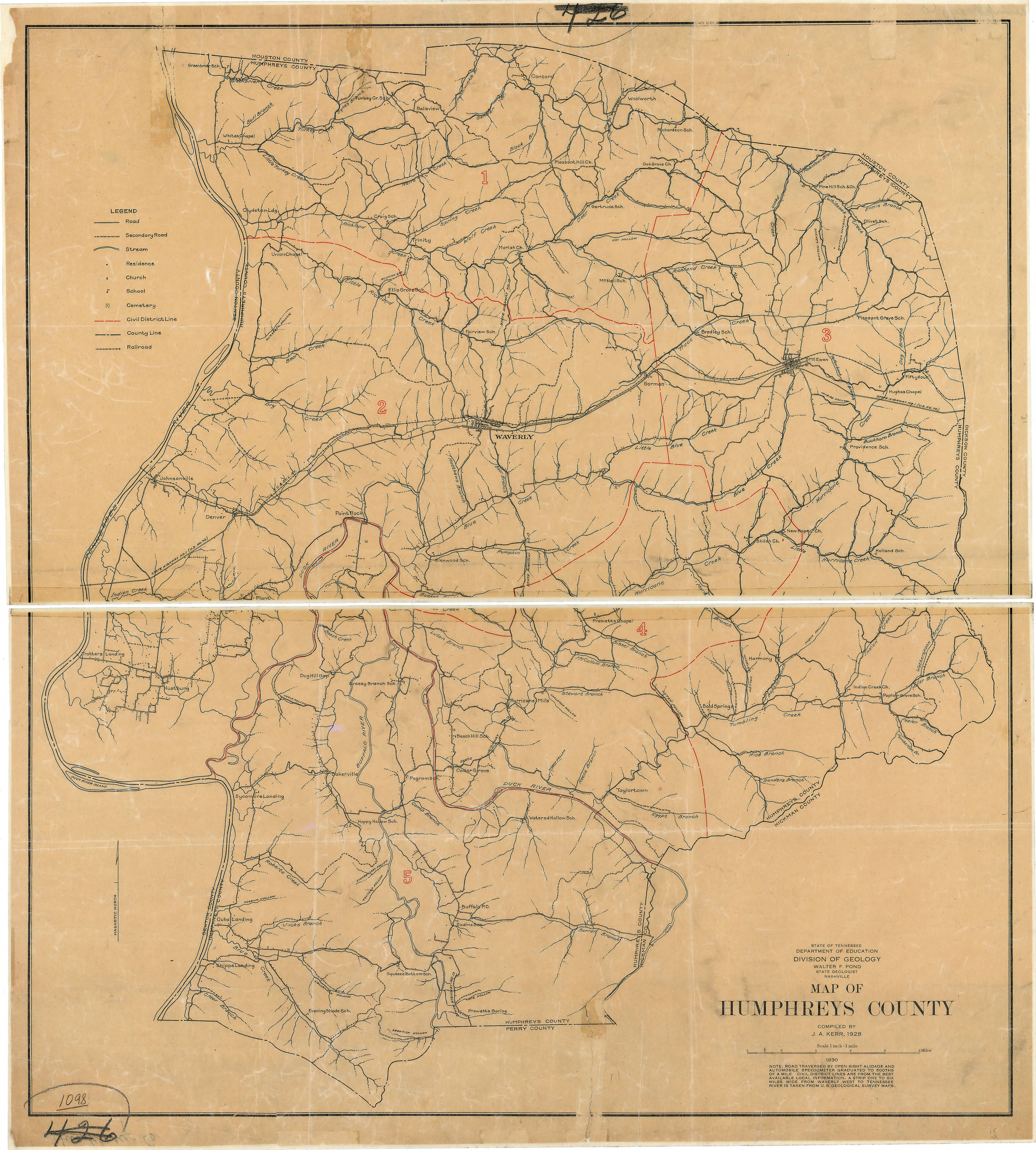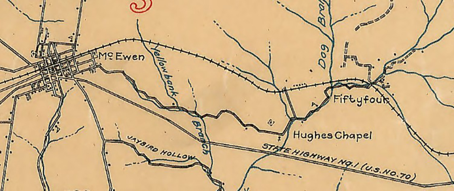 1928 map of Humphrey's County showing the railroad and the community of "Fiftyfour", 54 miles from Nashville on the railroad